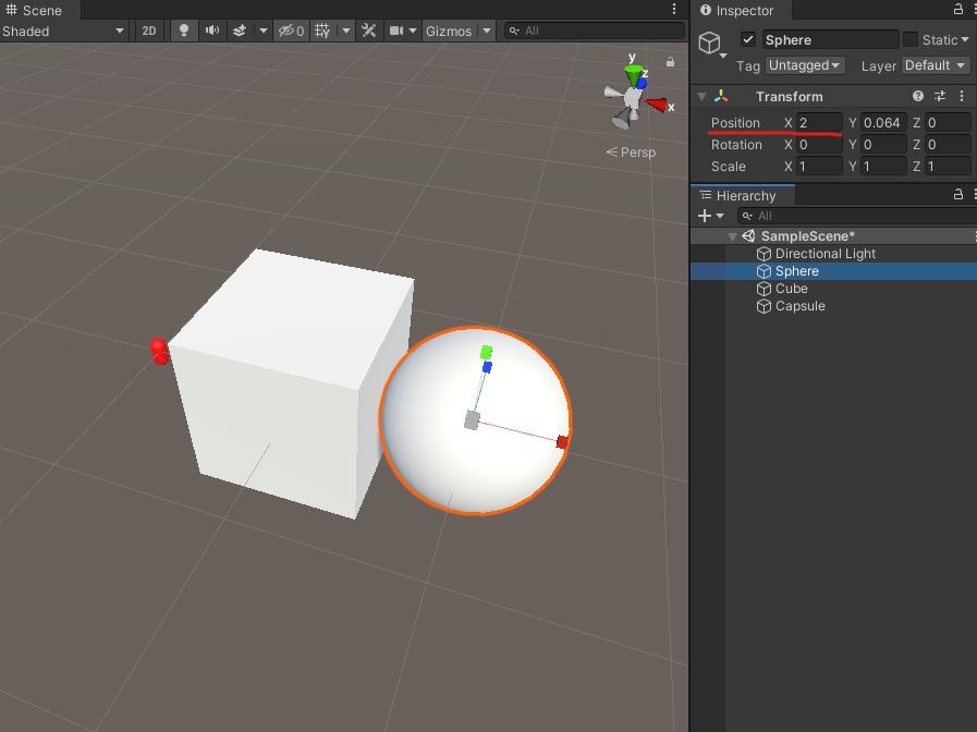 또한, 사진처럼 부모인 Cube가 움직이면 자식인 Sphere 가 Position, Rotation, Scale 이 변화함에 따라 자식도 같이 변하는 것을 알 수 있습니다.